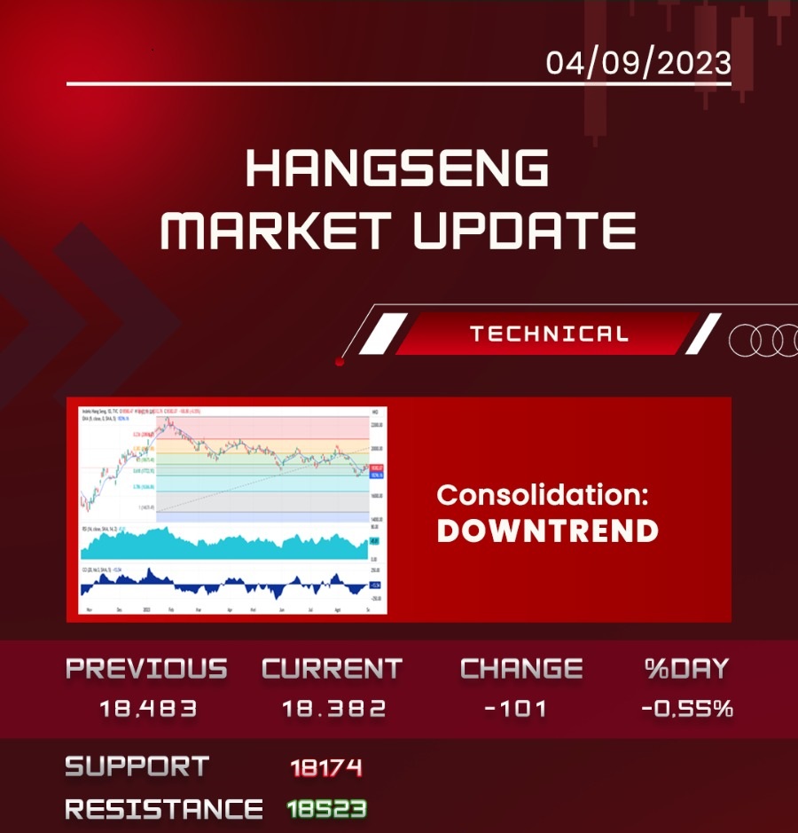 Hang Seng turun 100,80 poin atau 0,55% dan berakhir pada 18,382.06 pada hari Kamis setelah sesi yang teredam pada hari sebelumnya, menjauh dari level tertinggi dalam lebih dari dua minggu yang dicatat pada awal minggu dan tenggelam 8,1% secara bulanan, karena meningkatnya kekhawatiran bahwa perekonomian Tiongkok pemulihan mungkin akan tetap bergelombang di masa mendatang. Data resmi hari ini menunjukkan bahwa aktivitas pabrik di negara tersebut turun selama lima bulan berturut-turut di bulan Agustus sementara perekonomian jasa mengalami kenaikan paling rendah dalam 8 bulan. Berita bahwa PBoC sedang merancang kebijakan untuk memberi perusahaan swasta lebih banyak akses terhadap pendanaan gagal meningkatkan sentimen, dengan semakin meningkatnya skeptisisme bahwa langkah tersebut hanyalah langkah kecil dibandingkan dengan tantangan yang dihadapi perekonomian Tiongkok. Yang membatasi penurunan ini adalah kenaikan dalam kontrak berjangka AS, karena lemahnya data penggajian dan angka pertumbuhan PDB menunjukkan bahwa The Fed akan segera mengakhiri jalur pengetatan kebijakannya. Semua sektor menyeret indeks, di tengah penurunan tajam dari Orient Overseas (-9.9%), Wuxi Biologics (-4.8%), Meituan (-4%), Li Ning (-2.9%), dan JD.Com (-2.5%)